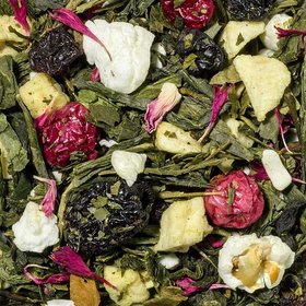 Appelstukjes, blauwe bessen, rozenbottelschillen, rozenblaadjes, hibiscus, aroma, braambessenblaadjes, zwarte aalbessenblaadjes, korenbloemblaadjes.