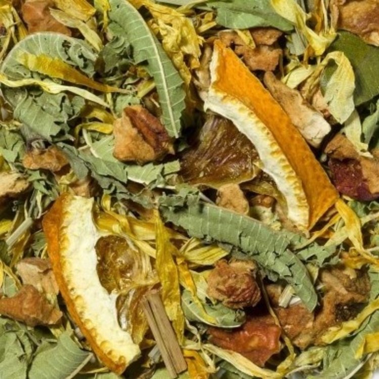 Stukjes appel, citrusschijfjes, citroengras, verveine, citroenmirte, goudsbloembloesemblaadjes.
