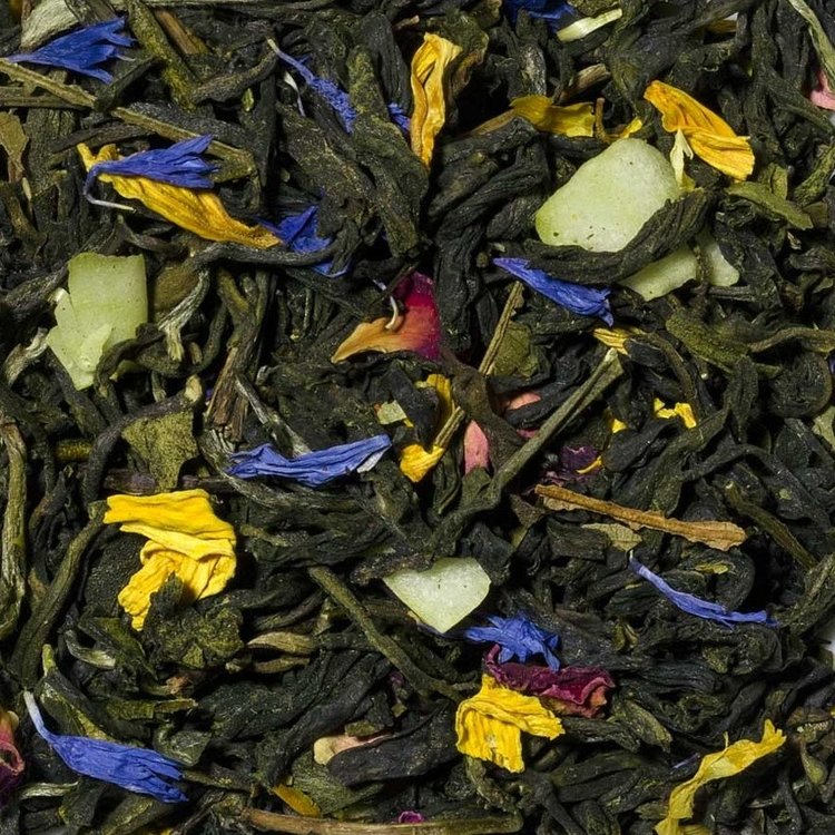 Witte thee, natuurlijk aroma, stukjes kokosnoot, braambessenblaadjes, rozenbloesemblaadjes, granaatappelbloesems, korenbloemblaadjes, goudsbloemblaadjes, zonnebloemblaadjes.