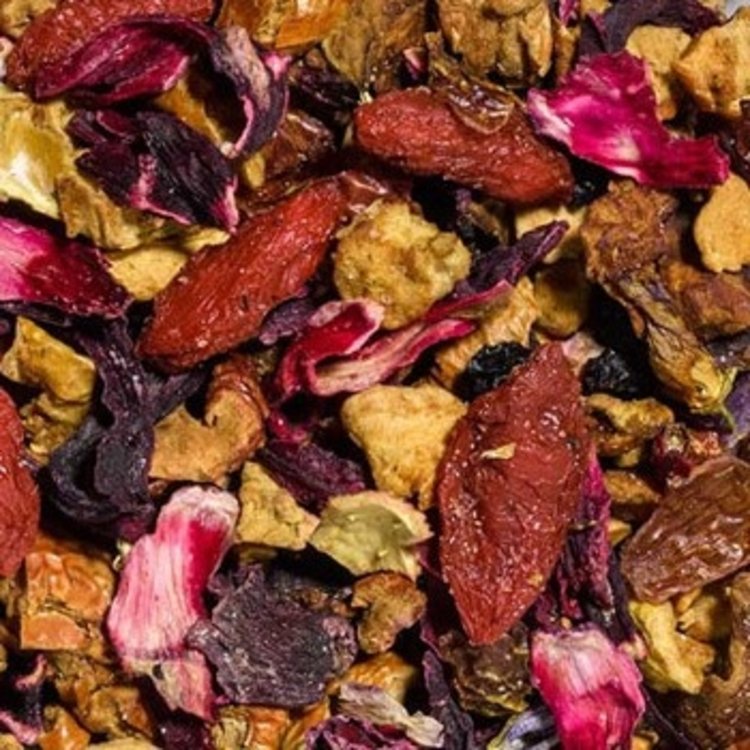 Appelstukjes, hibiscus, vlierbessen, rozenbottelschillen, gojibessen, natuurlijk aroma, vitamine c, echinaceawortel, gember, malvabloesems, limoenolie.