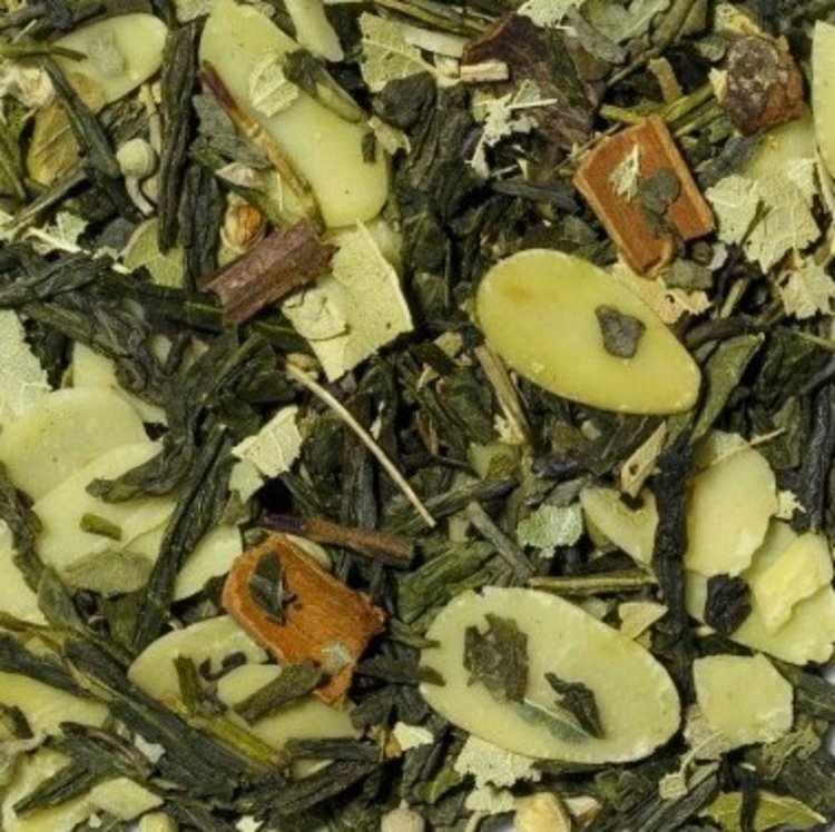 Groene thee, gehakte amandelen, lindebloesemblaadjes, natuurlijk aroma, kaneel.