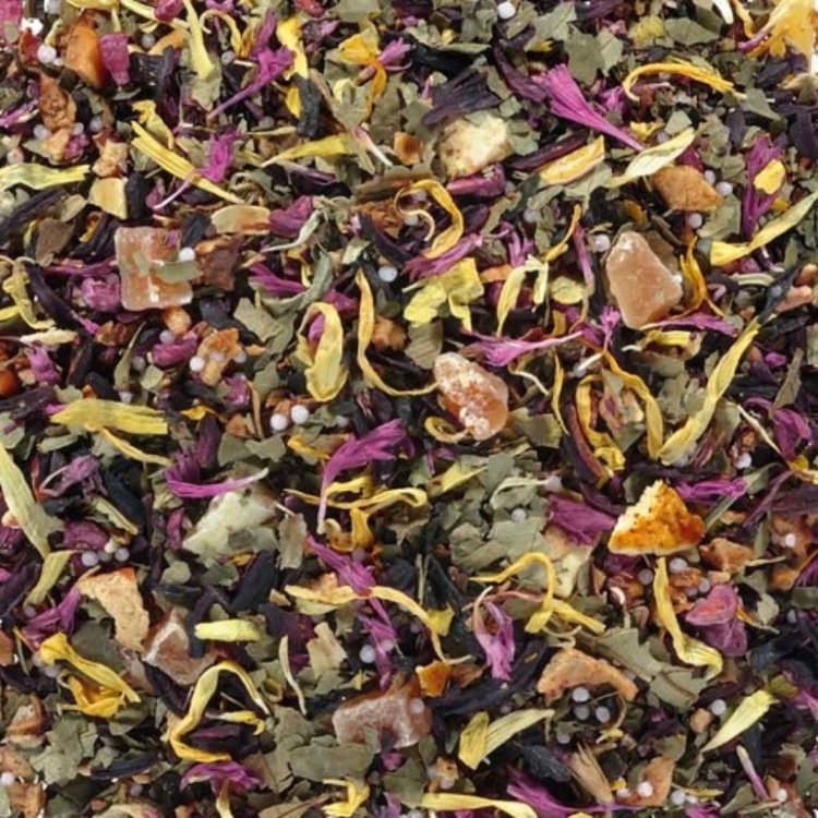 Hibiscus, papaja, stukjes appel, zoete braam, zoete sinaasappelschilletjes, framboos, goudsbloem, korenbloemen.