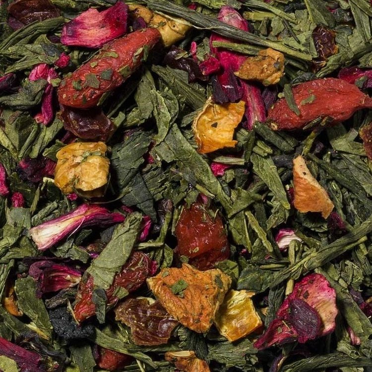 Groene thee, hibiscusbloesems, rozenbottelschillen, stukjes appel, goji-bessen, açai-bessen, natuurlijk aroma, stukjes framboos, granaatappelbloesems.