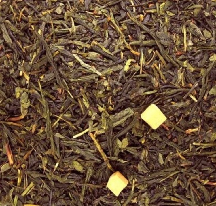 Groene Thee, aroma, room-caramelstrooisel (magere gecondenseerde melk, suiker, glucosesiroop, botervet, sorbit E420, emulgator E471).