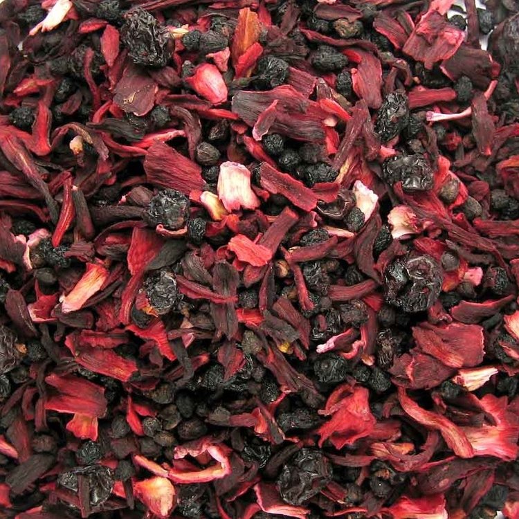 Hibiscusbloesem, druiven, vlierbessen, zwarte aalbessen, blauwe bosbessen.