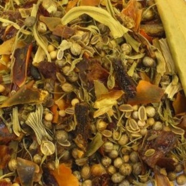 Ingrediënten: tijm, korianderzaad, oregano, majoraan, mosterdzaad, cayennepeper, laurierblad, dillezaad.