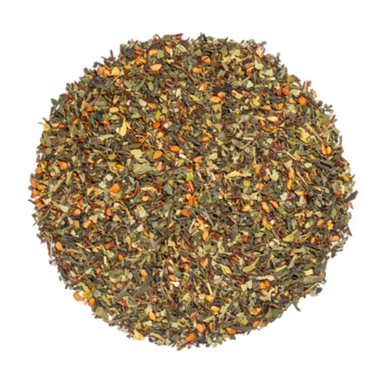 • Deze thee neemt je mee naar het hart van de Caribbean met deze exotisch fruitige melange van maté, groene thee, rooibos. Aangevuld met ananas en een beetje munt.