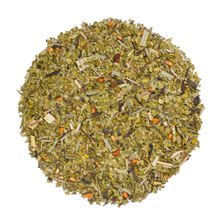 Groene thee, yerba maté, lemon en lemongrass. Van biologische oorsprong