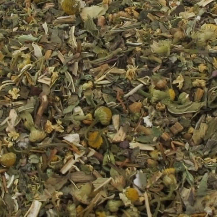 Ingrediënten: hoefblad klein, kamille, lindebloesem, pepermuntblad, hysop, vlierbloesem.