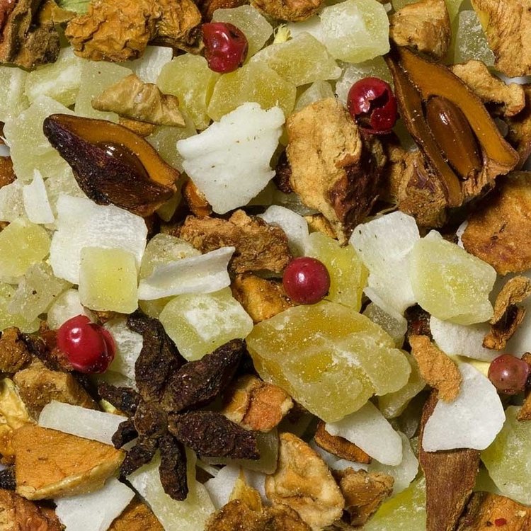 Stukjes mango, stukjes appel, kokoschips, steranijs, kaneel, kardemom, gember, zoethout, kruidnagels, roze peper, natuurlijk aroma.