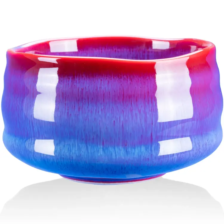 Deze traditionele, welgevormde Matcha-schaal "Seiun" (Japanse "Fog") is uitvoerig met de hand vervaardigd in een klassiek ontwerp en trekt de aandacht van iedereen met zijn opzettelijk onregelmatige vorm en de golvende rand, die het heuvelachtige landschap van Japan vertegenwoordigt. Het dik aangebrachte, glanzende glazuur in rood afgewisseld met witte onderstrepingen en contrasteert met het intense groen van de Matcha-thee. De kom loopt aan de bovenkant iets taps toe zodat de matcha niet spat als deze wordt opgeklopt.