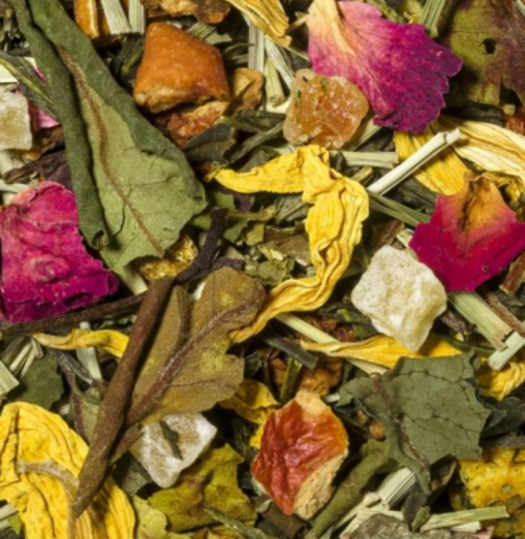 Groene thee, witte thee, citroengras, appel, sinaasappel, papaja, aroma, steviablaadjes, zonnebloemblaadjes, rozenblaadjes, pioenrozen, perzik
