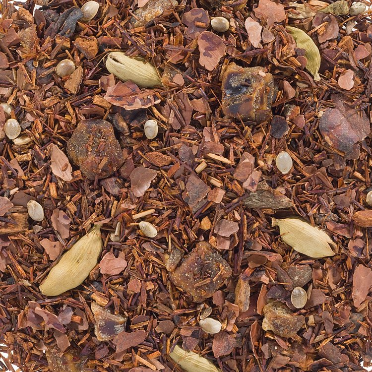 Rooibos, dadels, cacaodoppen, aroma, kaneel, kardemom, hennepzaad