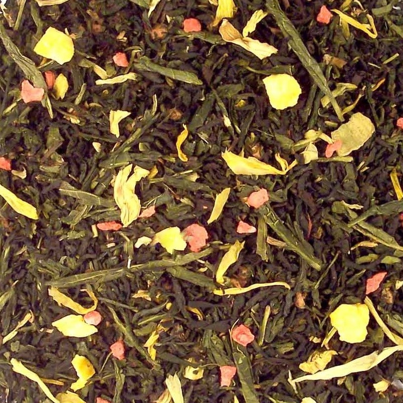 Zwarte thee, groene thee, aardbeien, citrusschilletjes, natuurlijk aroma, zonnebloembloesem.