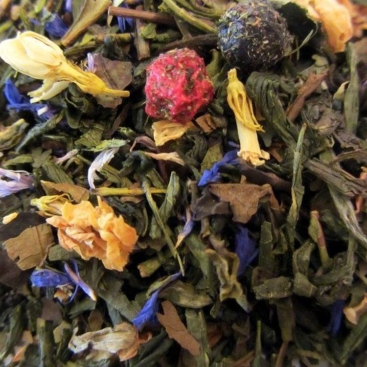 Groene thee, rode johannesbessen, natuurlijk aroma, zonnebloembloesems, korenbloembloesems.