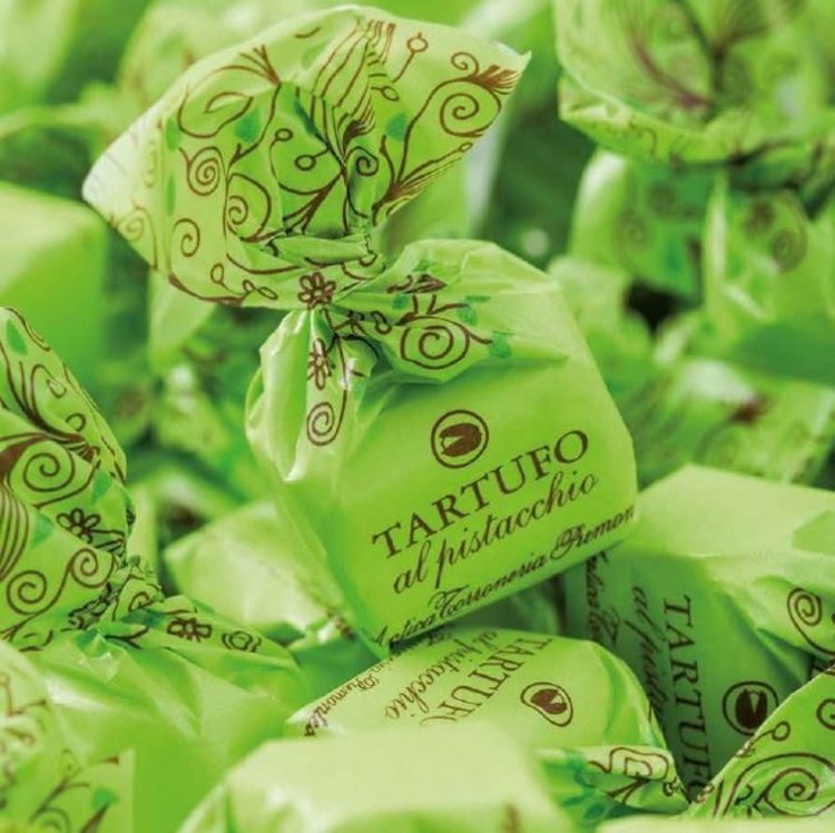 Een chocoladetruffel met stukjes Italiaanse pistachenoten.