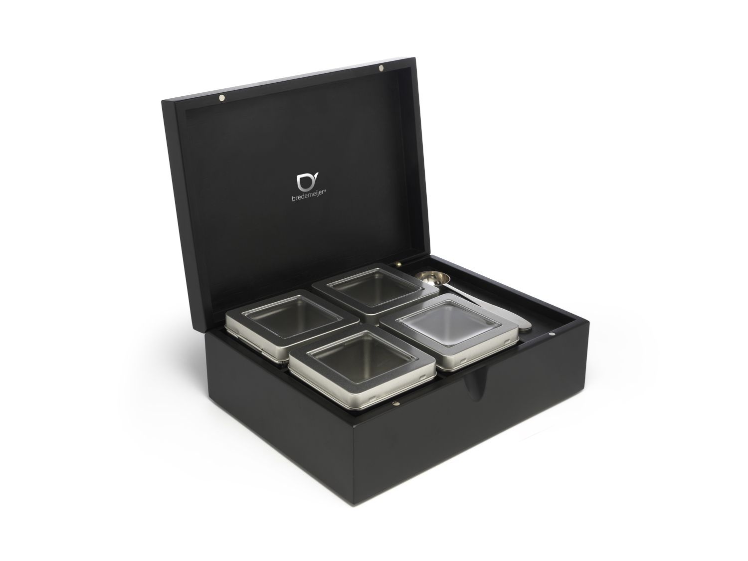 • De Bredemeijer Theedoos 4 vaks Bamboe Zwart is een theedoos gemaakt van zwart geverfd bamboe hout, een mooie onzichtbare magneet sluiting en 4 vakken.