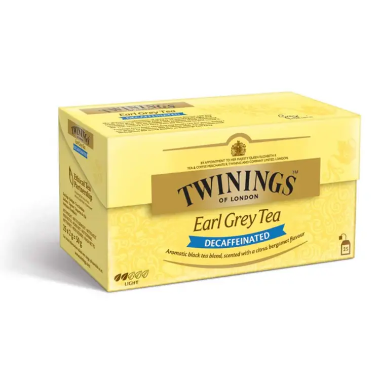 Twinings Tea: Earl Grey Decaffeinated. De Original Earl Grey thee, ontstaan uit een mooi verhaal, is het resultaat van een verrassende en geraffineerde combinatie van zwarte thee en de subtiele geur van bergamot, een citrusvrucht. Volgens de legende redde een Britse diplomaat het leven van een Mandarijn tijdens een reis naar China. Als dankbetuiging onthulde deze laatste aan de diplomaat een geheim: het recept van een Chinese thee met bergamotaroma. De zure toetsen van bergamot die doen denken aan citroenschil en pomerans, bezorgen deze zwarte thee een heel bijzonder accent.