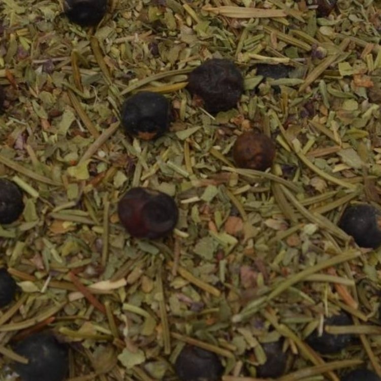 Ingrediënten: oregano, tijm, majoraan, jeneverbes, witte peper, laurierblad.