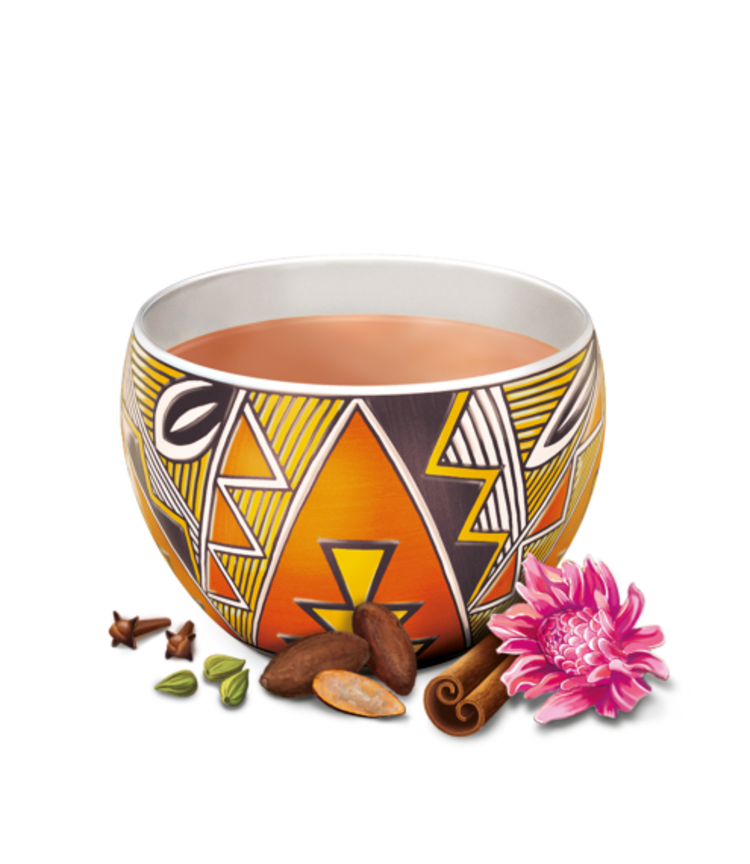 Cacaoschil, kaneel, kardemom, gember, geroosterde cichorei, kruidnagel, zwarte peper.